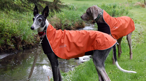The coats are beyond fabulous, soft and luxurious, look amazing, fit perfectly and kept the dogs (whippets) warm. They ran and played and those skinny legs, for the first time while wearing a coat were allowed to stretch to their fullest. Beautiful. Thank you for making just the perfect shaped coat for funny shaped dogs.”